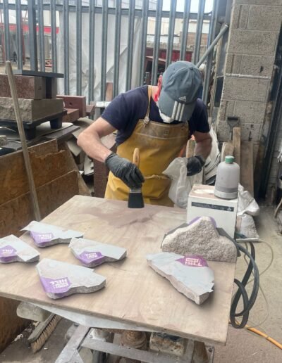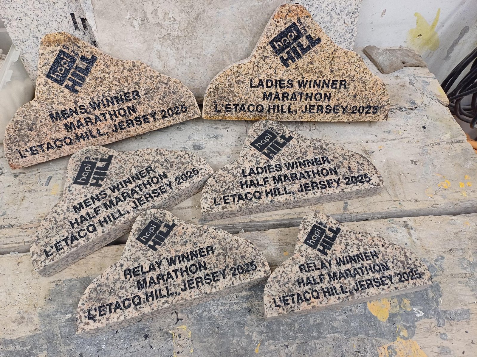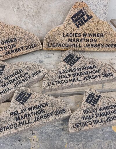 A bit about this project: ‘Hapi on the hill is not just another running event, it’s a unique experience.’ – With races ranging from 5km, 10km, half marathon and full marathon, the event had its inaugural running in 2025 and is set to become annual event to help raise money for Dementia Jersey. We were commissioned to help design, fabricate and inscribe unique trophies out of Jersey granite in the shape of the hill.